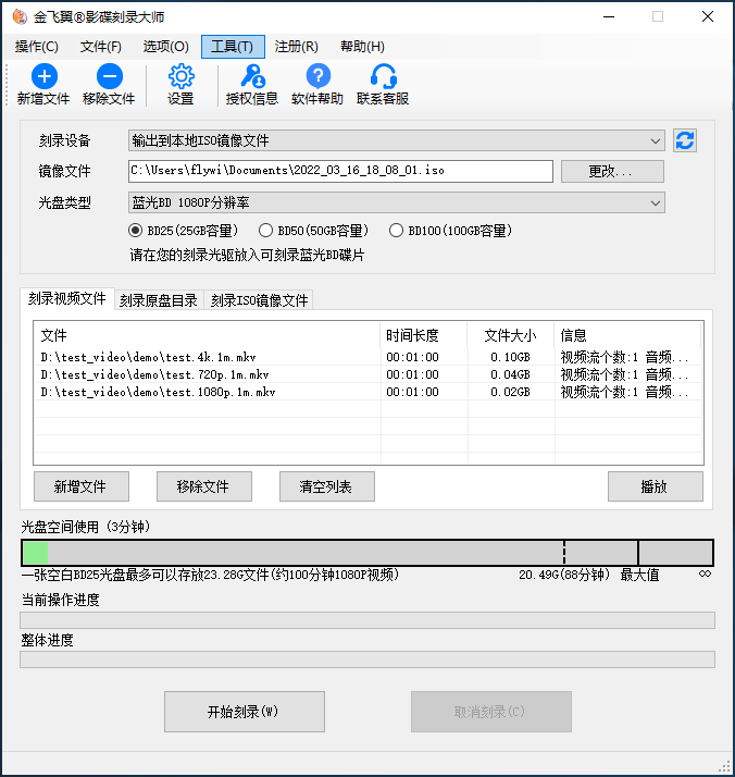 将可刻录蓝光光盘放入光驱中,并根据您购买的光盘实际容量选择光盘类型为BD25(25G容量)、BD50(50G容量)或BD100(100G容量)