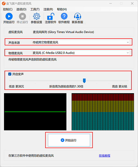 开始运行后,软件会自动读取对应物理麦克风的声音,然后对声音进行变声处理,最后传输到虚拟麦克风设备中。
