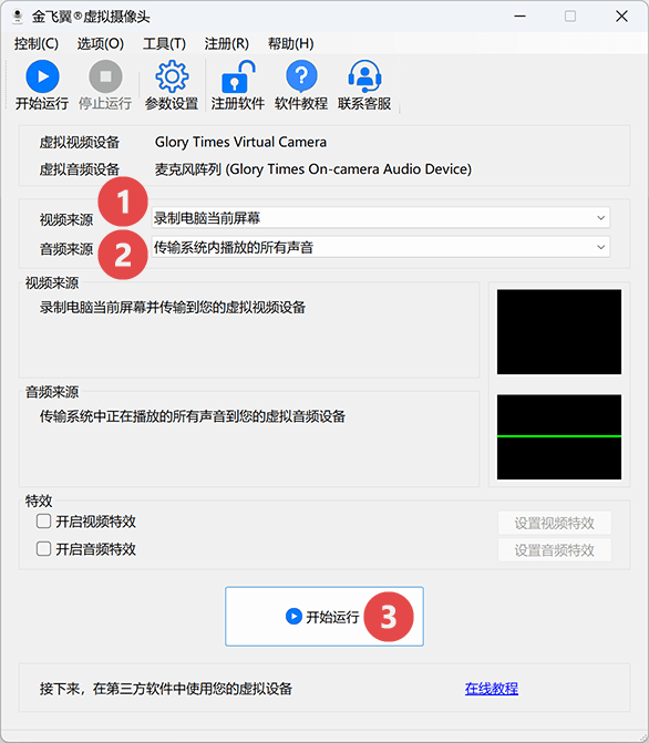 停止运行后,虚拟摄像头将输出黑色图像,虚拟麦克风将不再输出任何声音。